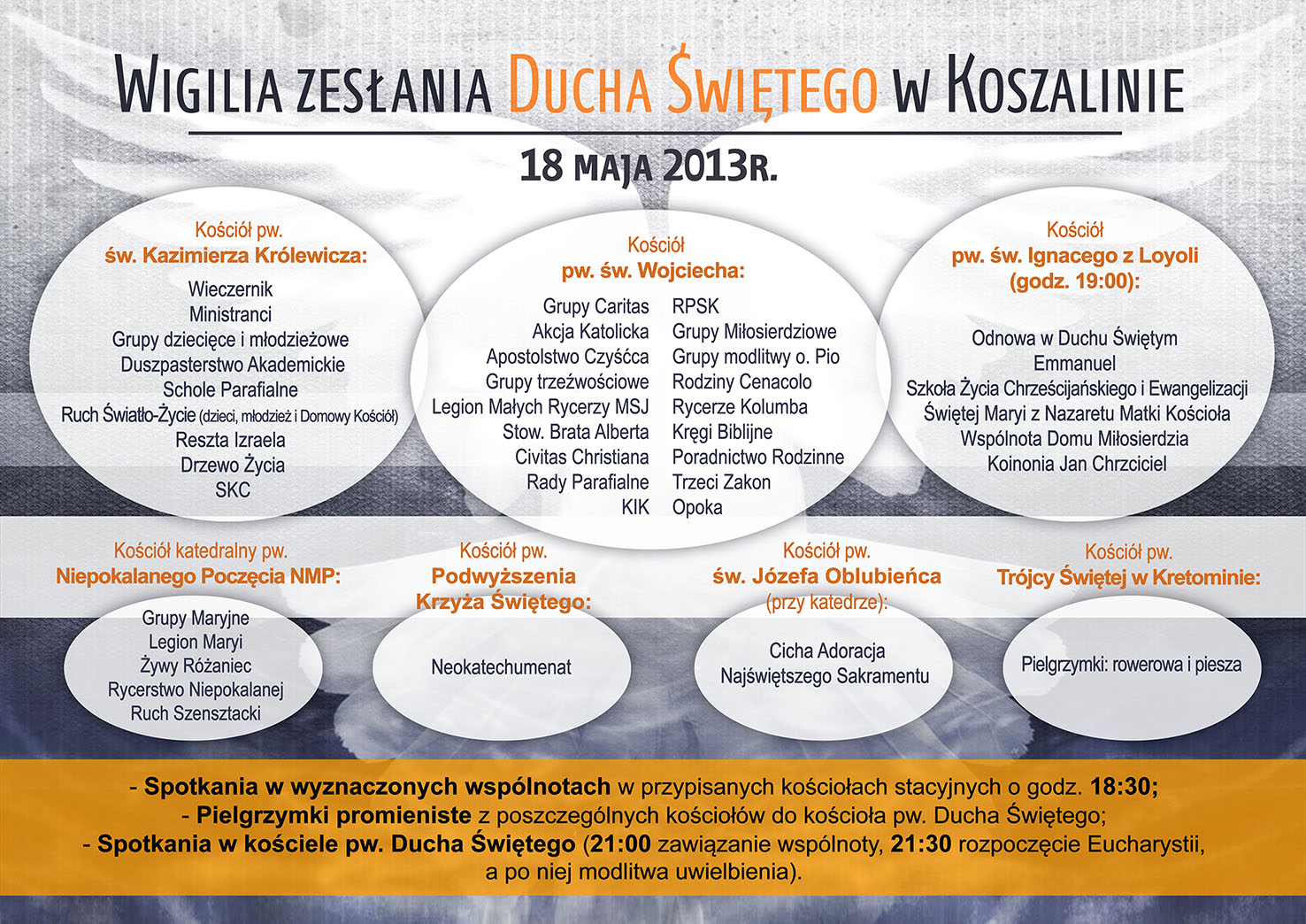 W wigilię Zesłania Ducha Świętego (sobota, 18 maja) w kościołach całego miasta spotkają się osoby należące do ruchów, grup i wspólnot, które istnieją w koszalińskich parafiach. Członkowie Ruchu Światło-Życie, oczywiście razem z Domowym Kościołem, zbiorą się o godz. 18:30 w kościele pw. św. Kazimierza przy ul. ks. J. Popiełuszki 2. Po wspólnej modlitwie, zgromadzeni tam wierni udadzą się w pielgrzymce do kościoła pw. Ducha Świętego, gdzie o godz. 21:30 będzie celebrowana uroczysta Msza Święta. Spotkanie zakończy się wspólnym uwielbieniem. Więcej